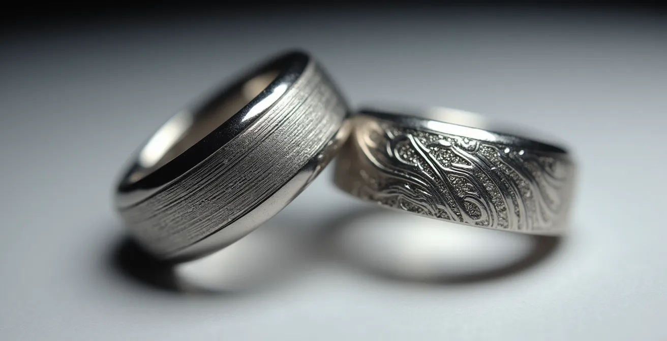 Die Erfahrungen der Goldschmiede Auronia zeigen deutlich, wie materialabhängig die Entscheidung ist. Bei hochglanzpoliertem Edelstahl erzielt die Natur-Gravur durch den brillanten Glanzschnitt eine hervorragende Lesbarkeit ohne zusätzliche Schwärzung. Das Licht bricht sich in den feinen Linien und lässt die Schrift aufblitzen. Bei matt gebürstetem Silber hingegen fehlt dieser Reflexionseffekt; hier ist eine Schwärzung für einen klaren Kontrast und gute Lesbarkeit unerlässlich. Für hochwertigen Goldschmuck wird oft die unbehandelte Natur-Gravur bevorzugt, da sie die edle Anmutung des Materials unterstreicht und als die puristischste Form der Veredelung gilt.